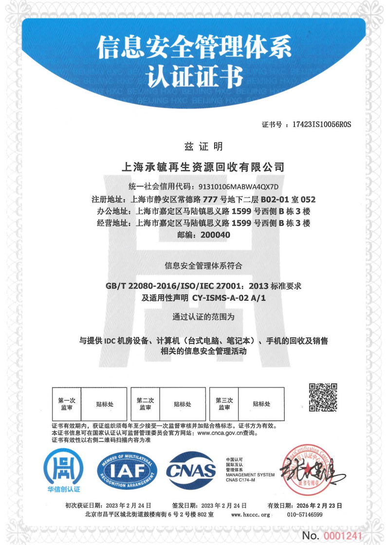 真实案例令人警醒:某制造业企业曾因旧硬盘未经安全处理便转售,导致关键技术图纸外泄,竞争对手借此抢先推出同类产品,使该企业直接蒙受千万元级别的经济损失。这一教训深刻表明,数据安全绝非单纯对于需要更高安全级别的场景,瑞科循环还提供物理销毁服务:通过精密机械进行硬盘打孔、高强度磁化消磁以及颗粒度达 2mm 以下的粉碎处理,确保存储介质彻底失去数据承载能力。所有销毁过程均实时录像存档,配合 ISO 27001 信息安全管理体系认证的流程管控,形成 “技术 + 流程” 的双重安全闭环,每一份销毁证明都可作为企业合规审计的有效依据。