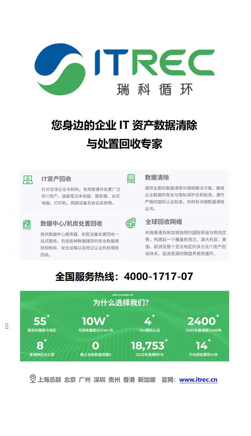 从 14 年行业经验的积累,到 8 大亚洲地区办公室的布局;从 ISO 国际认证的加持,到服务全球 55 个国家与地区的覆盖,ITRec 瑞科循环始终以 “数据安全 + 设备循环” 为双轮,在企业 IT 资产全生命周期管理中融入绿色基因。未来,ITRec 瑞科循环将继续以技术创新为引擎,为更多企业提供安全、高效、环保的 IT 资产处置方案,为实现 “双碳” 目标持续贡献力量
