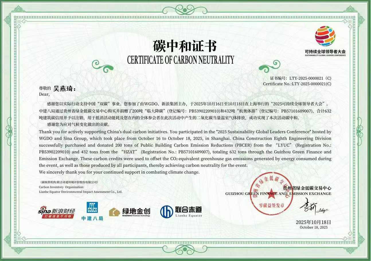 在 2025 年 10 月 16 日 - 18 日于上海举办的 “2025 可持续全球领导者大会” 上,ITRec 瑞科循环积极参与其中。此次大会通过中建八局从贵州省绿金低碳交易中心购买并捐赠的 632 吨建筑碳信用(含 200 吨 “临大降碳” 与 432 吨 “杭奥体游”),成功抵消活动能耗及全体参会者产生的温室气体排放,实现活动碳中和,ITRec 瑞科循环也因此与这一环保成果深度绑定,彰显企业在可持续发展领域的坚定立场。ITRec瑞科循环碳中和证书