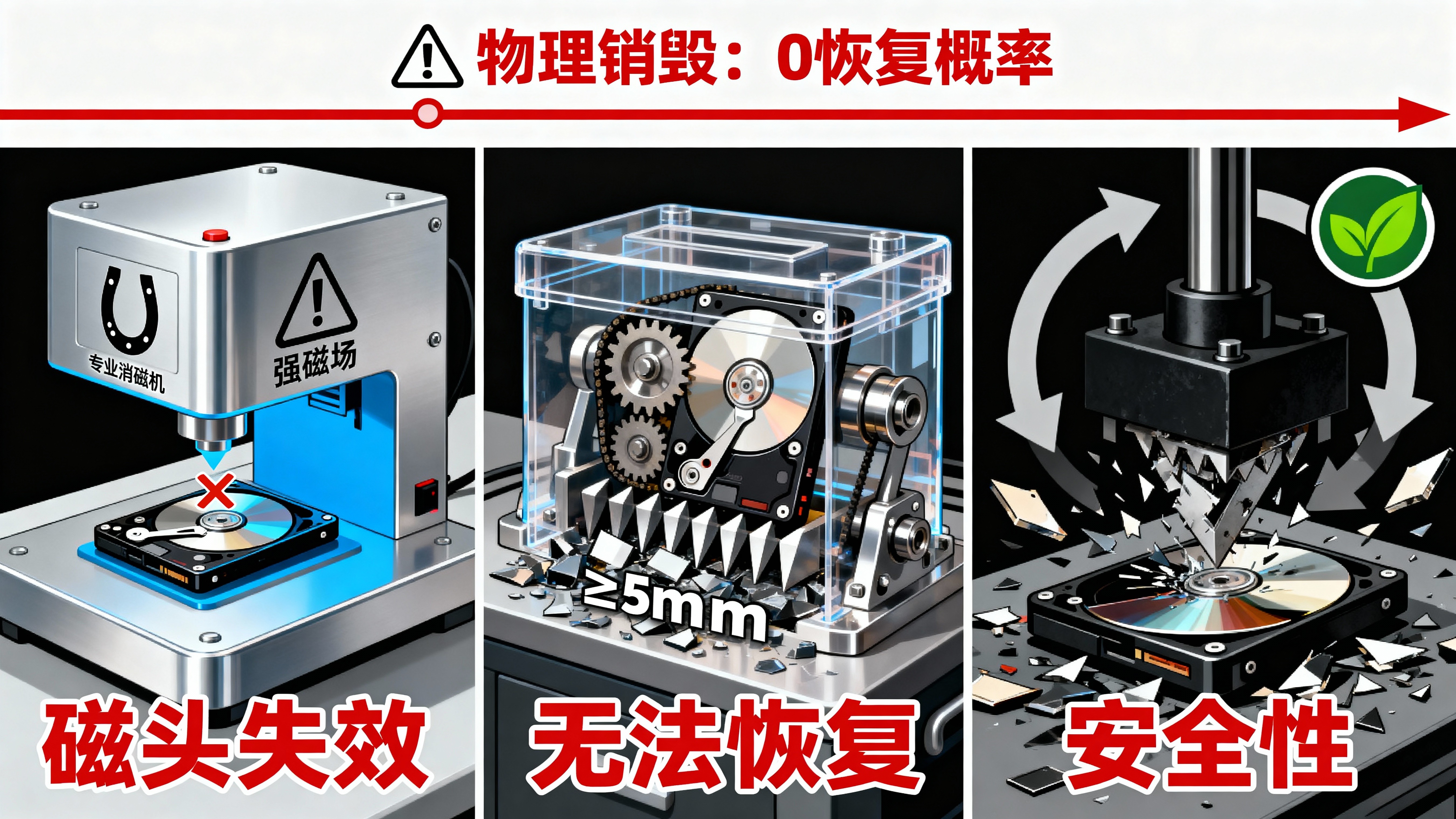 物理销毁 | 1. 数据恢复概率为 0,安全性最高;2. 处理速度快(单块硬盘仅需几分钟);3. 适配故障硬盘、报废硬盘;4. 无需复杂技术,操作简单。 | 1. 硬盘完全报废,无法二次利用,资源浪费;2. 需专业设备(消磁机、粉碎机),成本较高;3. 物理粉碎 / 焚烧需符合环保要求,处理流程繁琐。 |
